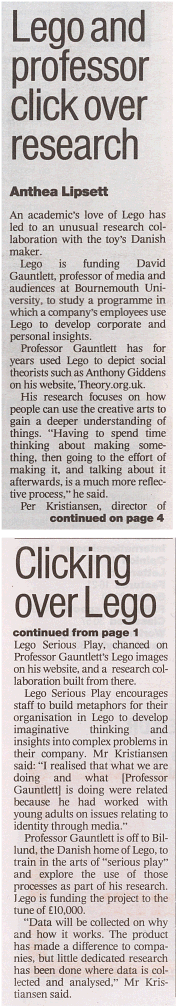 LEGO + ARTLAB COLLABORATION The Times Higher Education Supplement featured this cover story about the ArtLab collaboration with Lego Serious Play (April 2005). For more information see project information, and the ArtLab website in general. For the principles of this approach to creative research - and the findings from the Lego study - see the new book Creative Explorations (2007). Update: In September 2007, Creative Explorations was shortlisted for the Times Higher Young Academic Author of the Year Award (details).