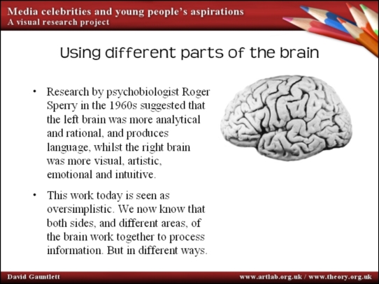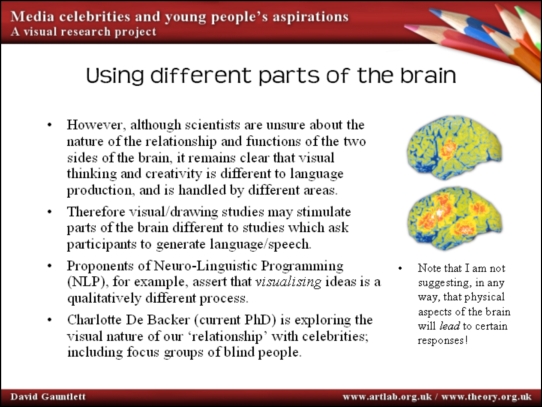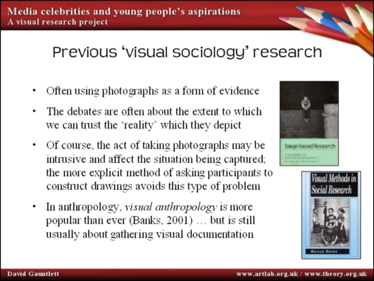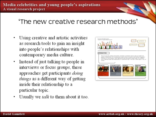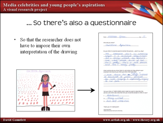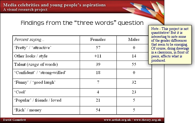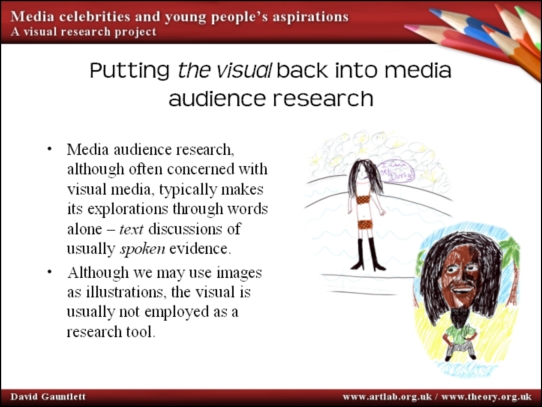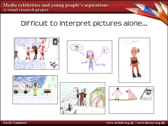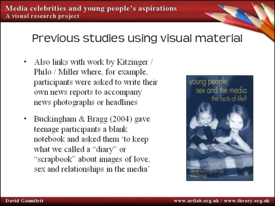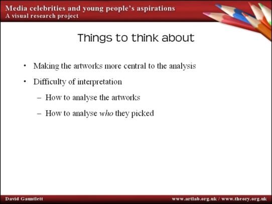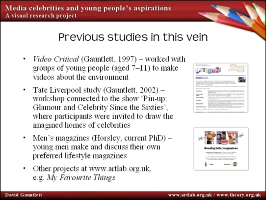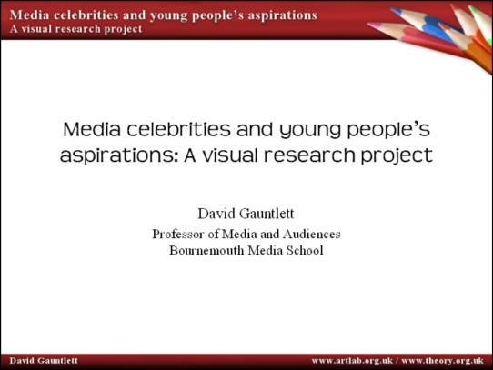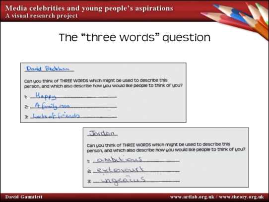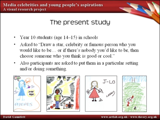 MEDIA CELEBRITIES AND YOUNG PEOPLE'S ASPIRATIONS - A visual research project This project is under way at the moment, with fieldwork being conducted November 2003 - March 2004. I gave a talk about the 'work in progress' at the UK's Media, Communication and Cultural Studies Association conference (19–21 December 2003). The Powerpoint slides appear below. Of course, viewing the slides without the explanations doesn't give you much depth or detail, but hopefully the slides are reasonably self-explanatory.